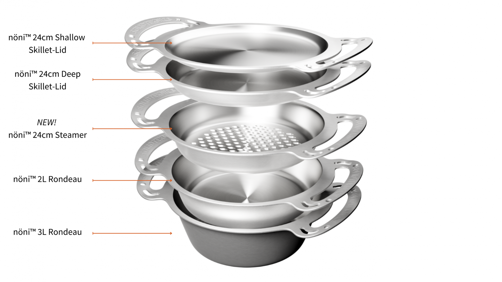 Our most versatile, modular set yet: a 24cm nöni™ Steamer that fits with both our 2L Rondeau AND 3L Rondeau! Mix and match all five pieces depending on your cooking needs. Plus they all nest together for easy storage!