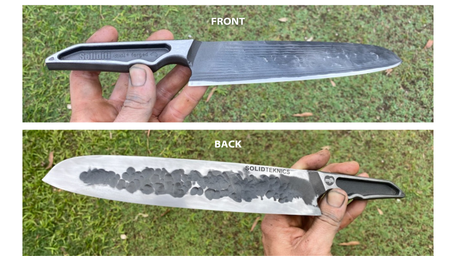 These knives are the antithesis of mass production. Once cast, they will then be hand forged, hand ground, and finally hand sharpened, before being hand-engraved by Mark! No two knives will be the same. We consider this handmade finish a thing of beauty as it shows the love and hard work that has gone into each and every knife. Form and function. Art meets engineering. Check out Mark (our founder and design engineer) hand forging the very first 25cm Chef/Carving Knife prototype!