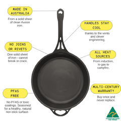 Crafted from 4mm-thick clean Australian iron, this flat, pan offers exceptional heat retention and even cooking across its entire surface, making it just as perfect for stovetop use as it is for the BBQ or campfire.