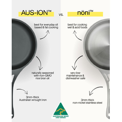 Naturally non-stick with seasoning (AUS-ION™) and low-maintenance stainless steel (nöni™)