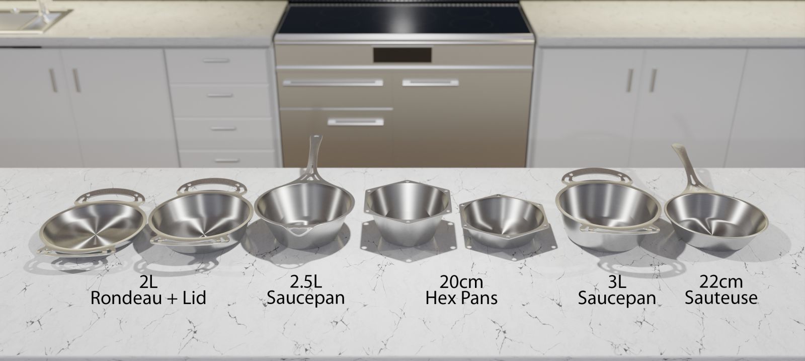 For sizing comparison - below is the 2.5L saucepan, 20cm hexagon pan and 3L Rondeau base.