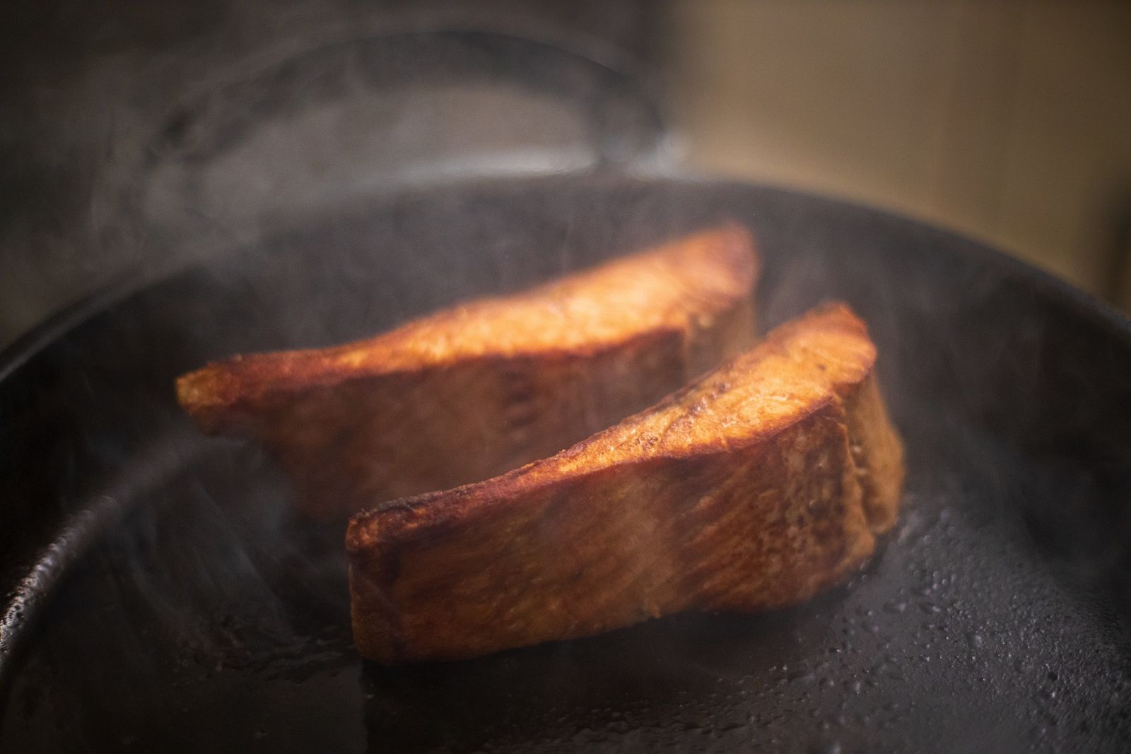 When cooking, searing, frying etc in our iron pans, patience is key. Let your food develop that perfect caramelised crust before attempting to move or flip it. Once it forms, your food will naturally release from the pan, just like a flawlessly fried egg with crispy edges (trust the process).