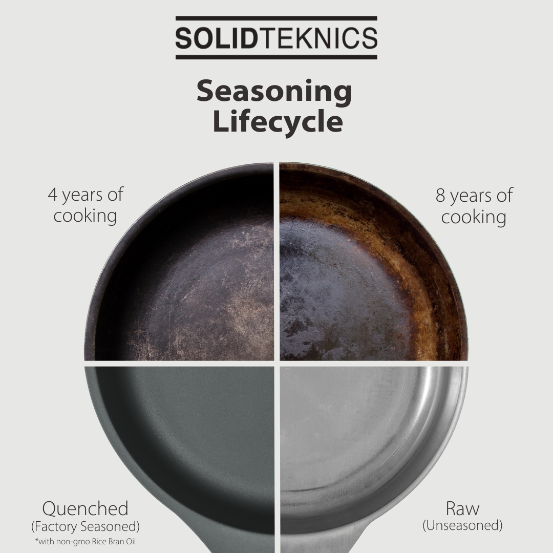 The Solidteknics wrought AUS-ION™ 'Quenched' range comes pre-seasoned and ready for you to cook with. We have patented a new way to season iron that heavily reduces pollution. We do this by instantly dropping a very hot pan into the vat of the right oil; you get a pan that's 'Quenched' and ready to cook right out of the bag! We choose to season our pans with non-GMO rice bran oil, which has a high smoke point.