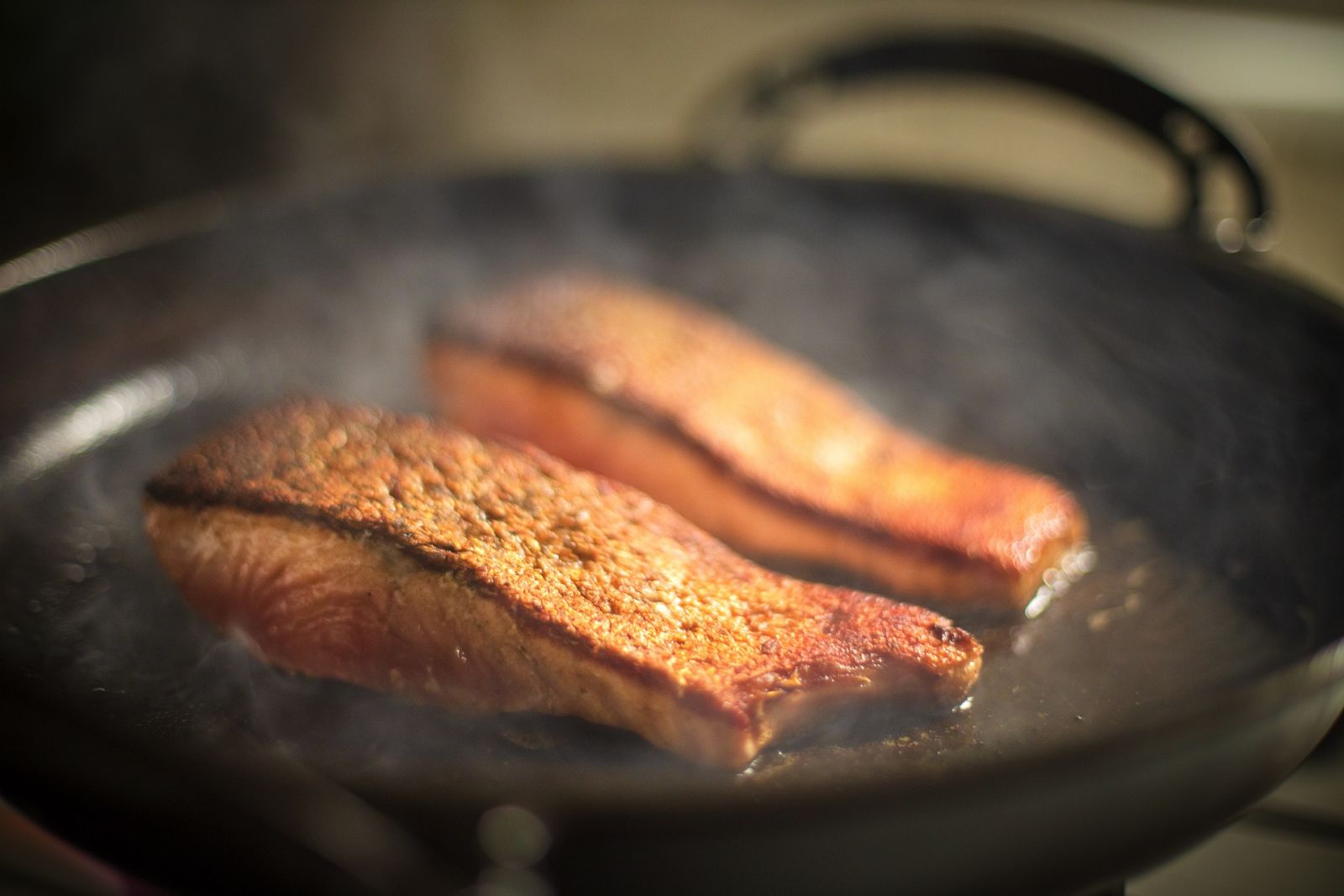 7. Gently place your salmon portions skin side down into the pan, pressing each portion down with a spatula for 10 seconds to allow the skin to flatten and form to the surface of the pan.