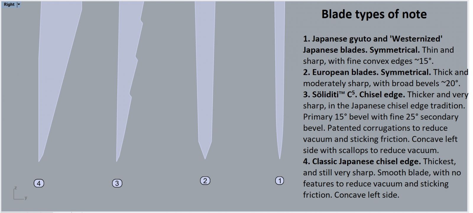 These blades are legendary among serious knife users because they are simply the sharpest (practical) blades, by nature of their geometry (one bevel crushing the food, instead of two, in simple terms). We used that principle as a starting point, then did something entirely different with the blade geometry to radically reduce 'sticking friction', and basically eliminate the sticking of sliced food to blades.