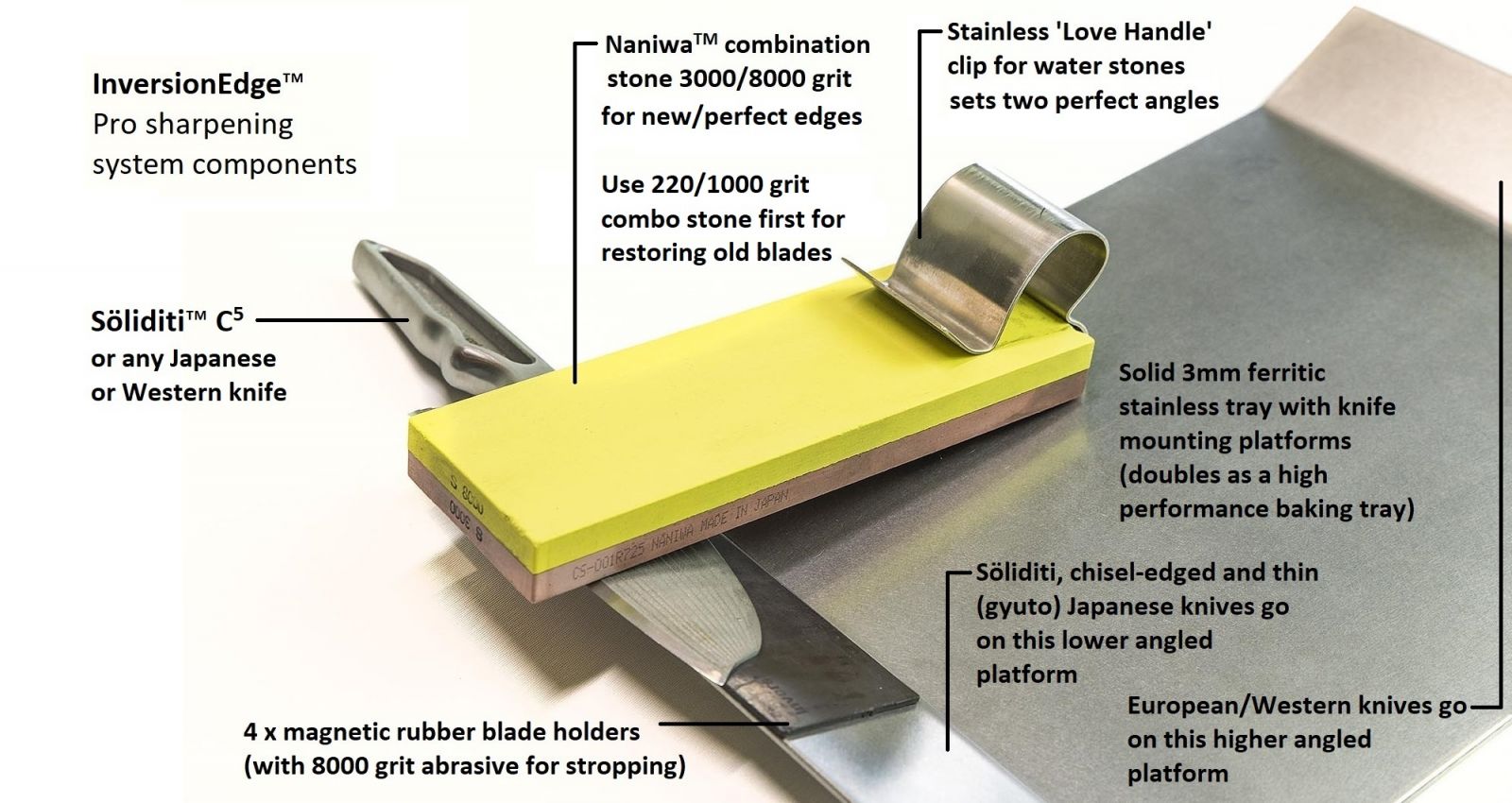 Pair your Söliditi™ knives with our InversionEdge™ sharpening system, and you will have, for the first time ever, the ability to quickly and easily maintain ‘old master level’ cutting edges on the highest performance chisel edge blade. No decades of traditional practice on stones. No complicated rods and adjustments. No destructive drag-through gadgets. With no special skills.