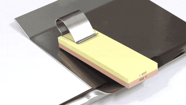 It all depends on the condition of your blade. The easiest is to work for two minutes then test the edge. If it feels sharp, stop, otherwise you’re just removing more precious blade material for no benefit. We recommend cutting some food, particularly tomato, as a good real-world test. Do not use finger feel unless experienced! If edge isn’t sharp, continue the process and test every few minutes. If the fine stone really isn’t working, switch to the coarse stone to create new secondary bevels, repeating sharpening process until edge feels sharp, then switch back to the fine stone to finish off the tiny primary bevel.