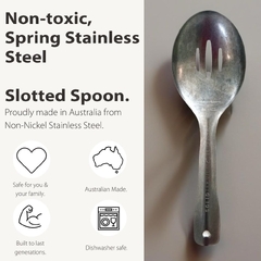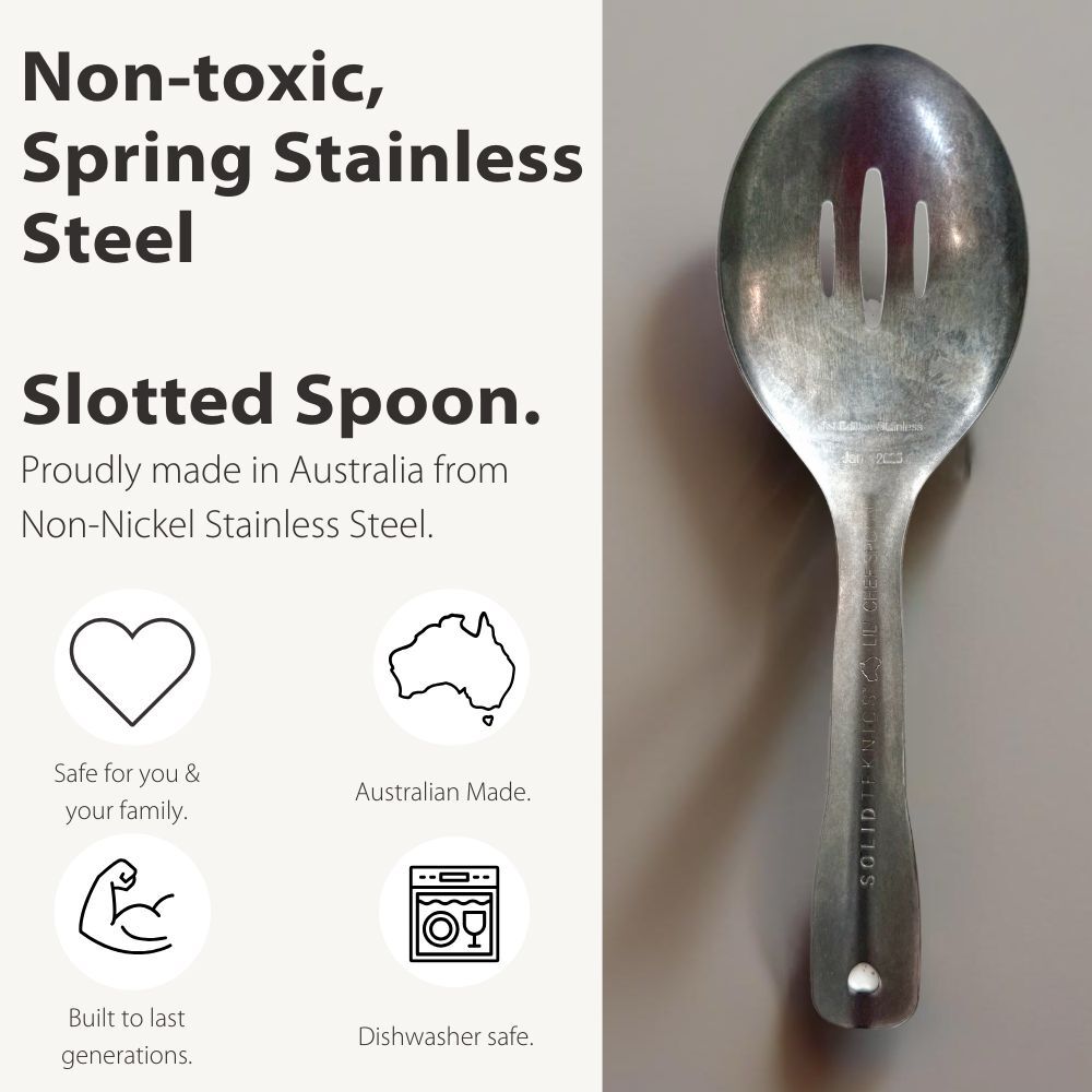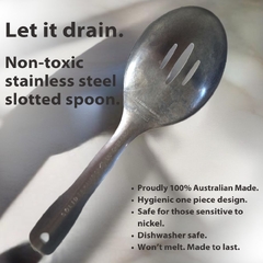 Proudly made in Australia from a single 1mm-thick piece of stainless steel, this spoon is built to last for generations. Its carefully placed slots ensure efficient draining, making it just as handy for lifting blanched veggies, skimming foam off stocks, or pulling fried bites from oil.