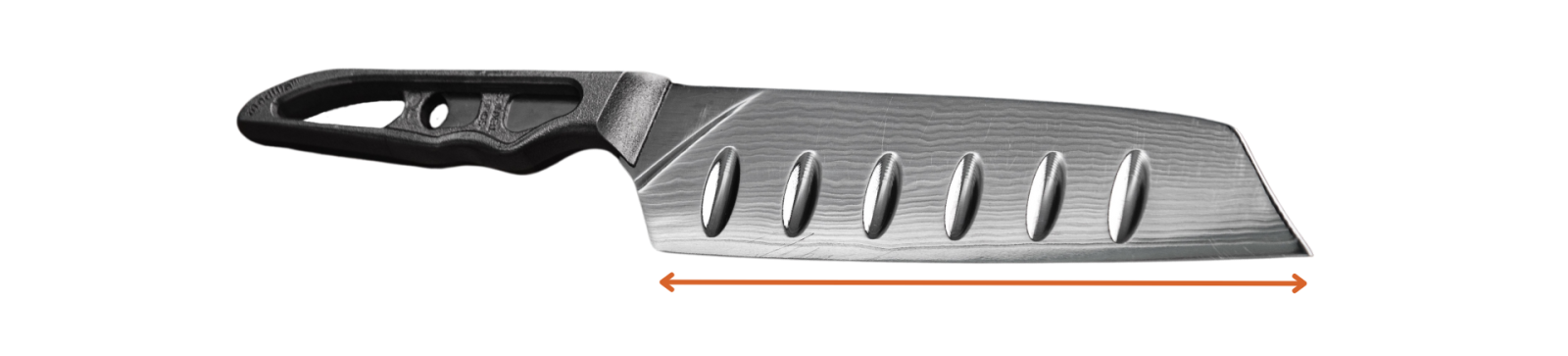 Our Modüla™blades are measured along the cutting edge, as shown in the graphic below. So, the cutting edge of our 17cm Santoku blade is 17cm long, and the cutting edge of our 22cm Carving blade is 22cm long.
