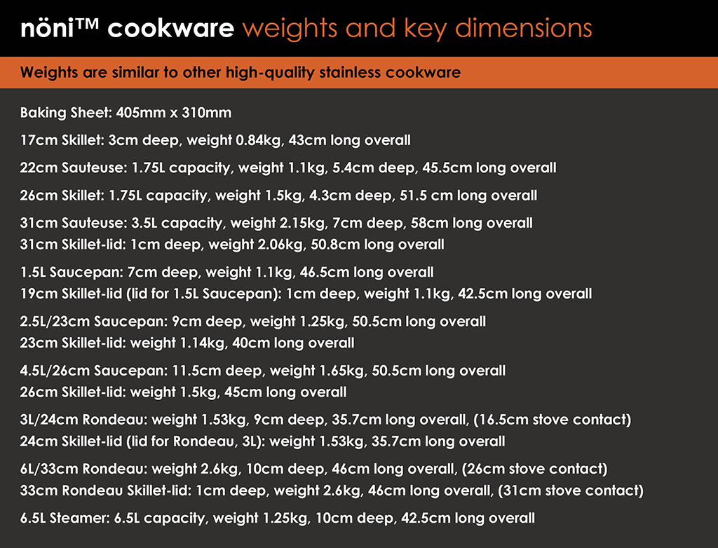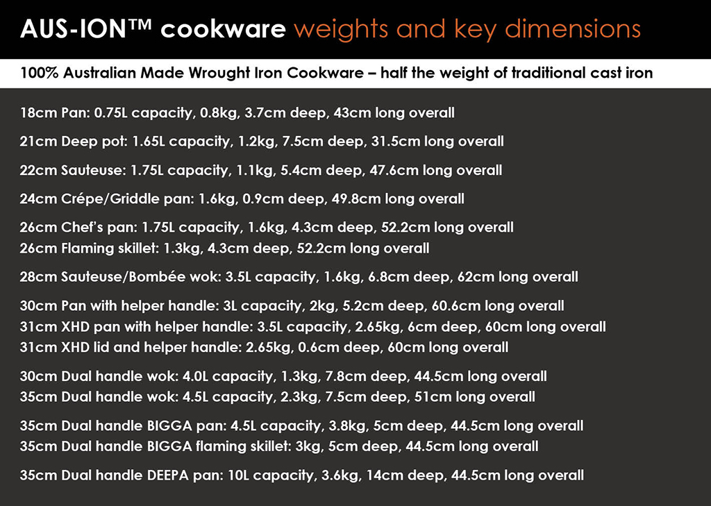 You'll find all of the product dimensions for our pans and cooking tools, in the product listings on our website HERE.