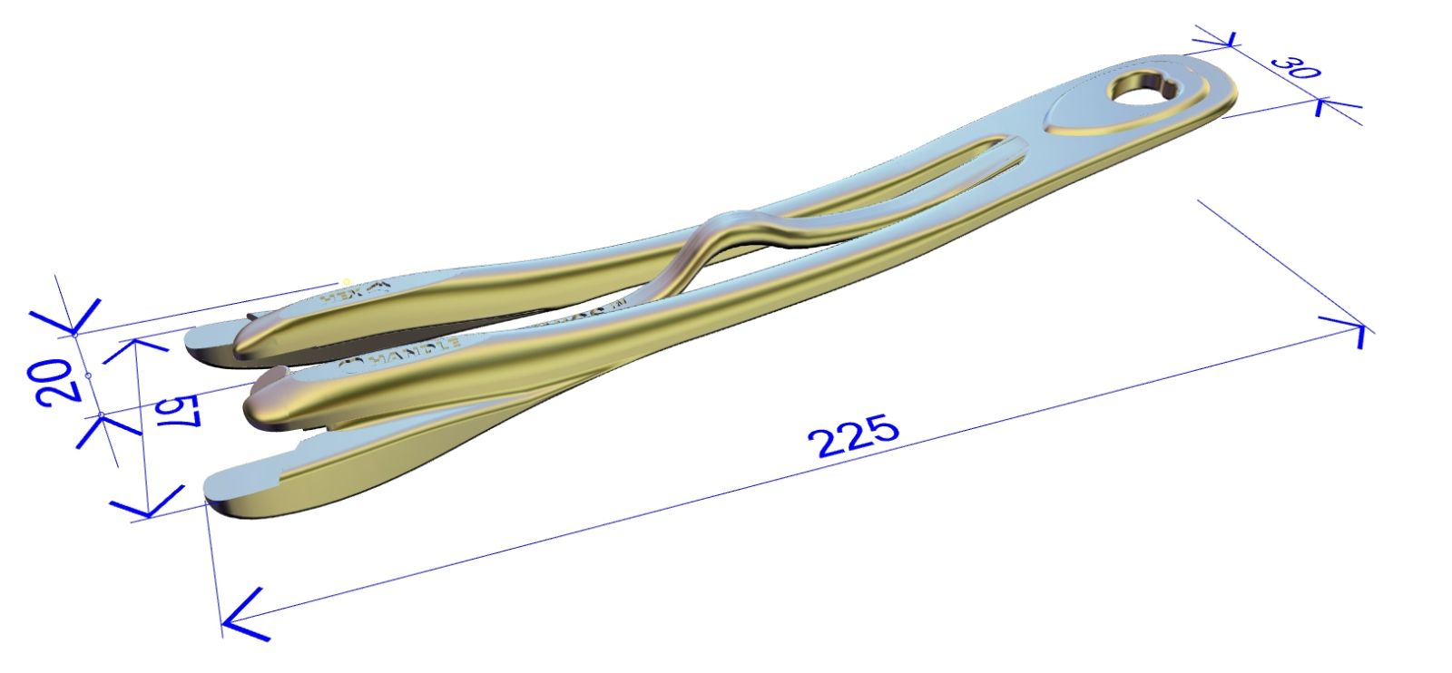 Size: 225mm long, 57mm wide, 20mm thick, at widest points.