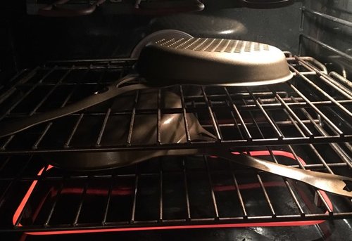 3. Increase the oven temperature to 250°C. Place the pan upside down in the oven for 1.5 - 2 hours. Switch the oven off and without opening the door, leave the pan to cool in the oven for at least 30 minutes, or ideally overnight. Barbecues are ideal for seasoning, keeping any smoke outdoors.