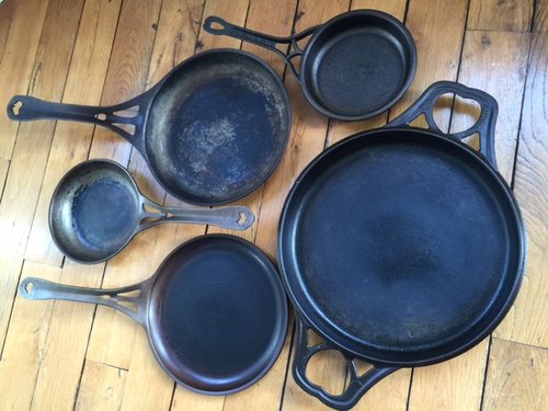 A well-seasoned pan will often patchy in reality. Seasoning will change overtime, and will continue to get better the more you cook. Looks aren’t important - our pans are built for performance! Below is a photo of our founder Mark Henry's pans from his home collection!