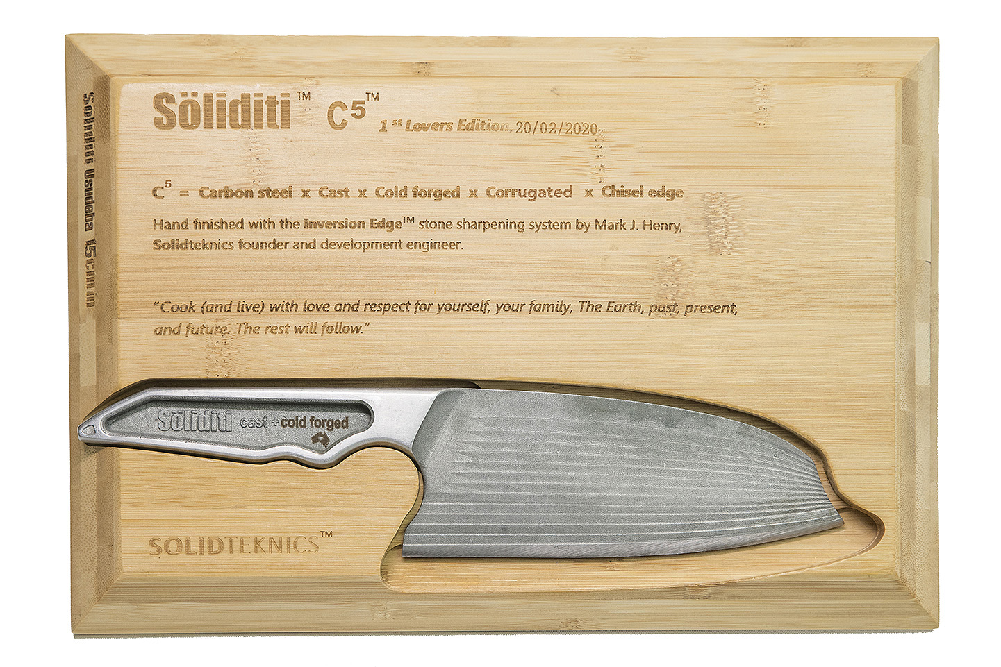 There are a lot of world-firsts distilled into the achievement of this Söliditi™ knife, and some will never be known beyond our founder/engineer Mark Henry and his tech team, for reasons we’ll explain below*. All the manufacturing and materials tech detail we are able to share with our core Lovers Group members is summarized here and on our Facebook Lovers Group page (much more than will eventually be shared with the wider public).